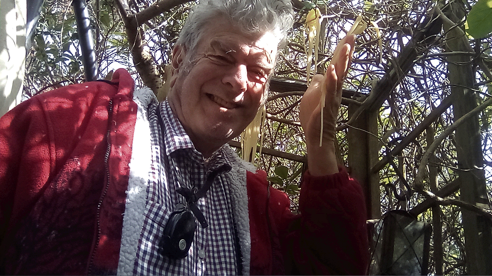 Robin and June pose proudly beside the Spaghetti Tree in their back garden