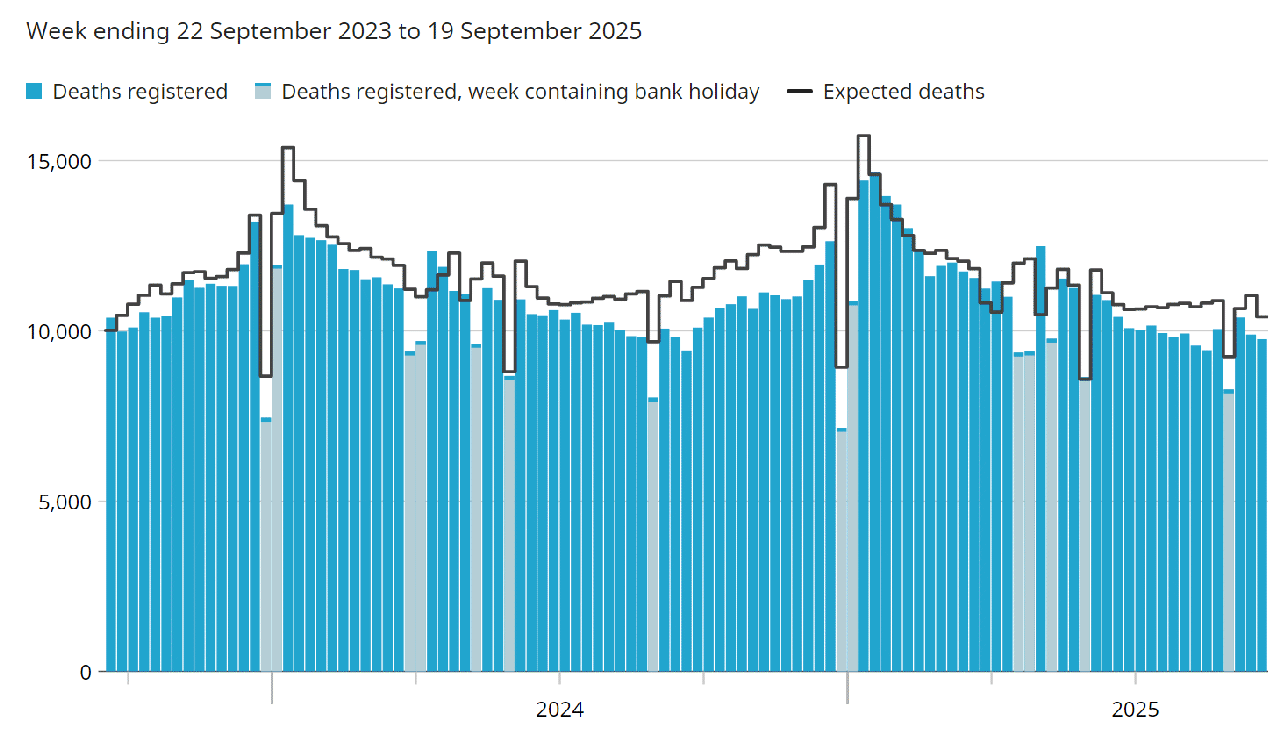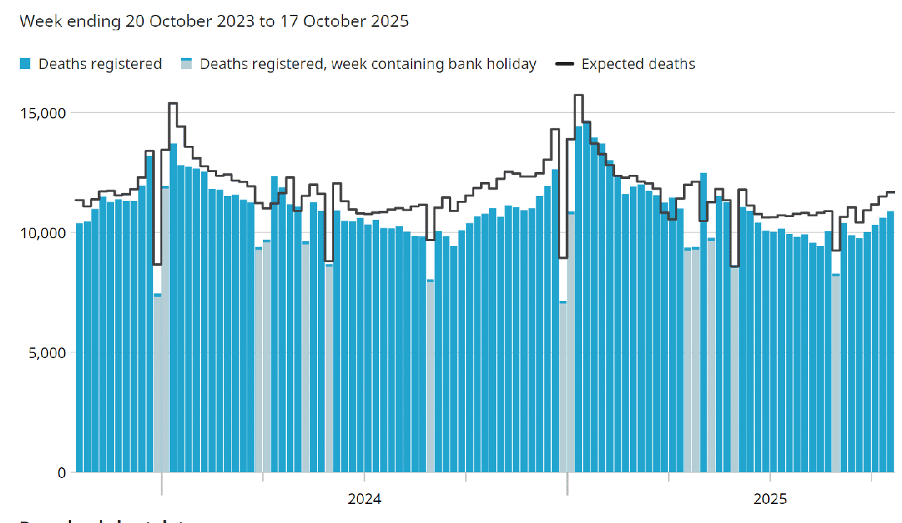 Tuesday 3rd November 2020: The ONS switch to publishing seperate graphs for England and Wales, instead of the combined graph since April.