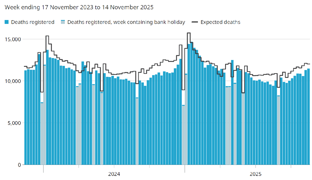 Tuesday 23rd November 2021: Nice change in ONS graph format: Well Done Guys ! :-) 22 March 2022: Clearer if graph of total deaths compared with 5 year average before 2020 and Covid19 had an effect ?