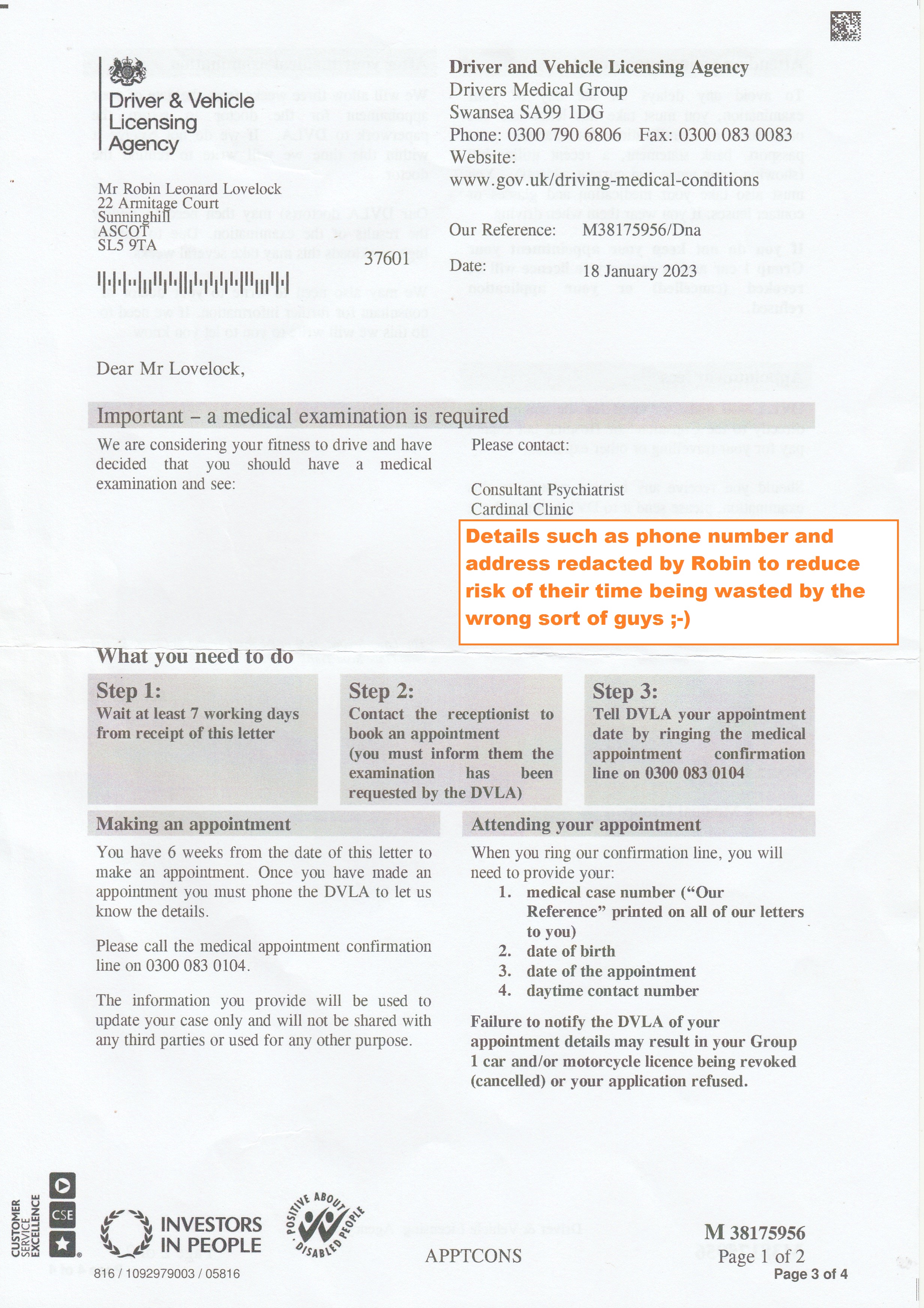 16. Footnote after (uncorrected?) letter from DVLA of 18 Jan 2023 (Medical Examination).